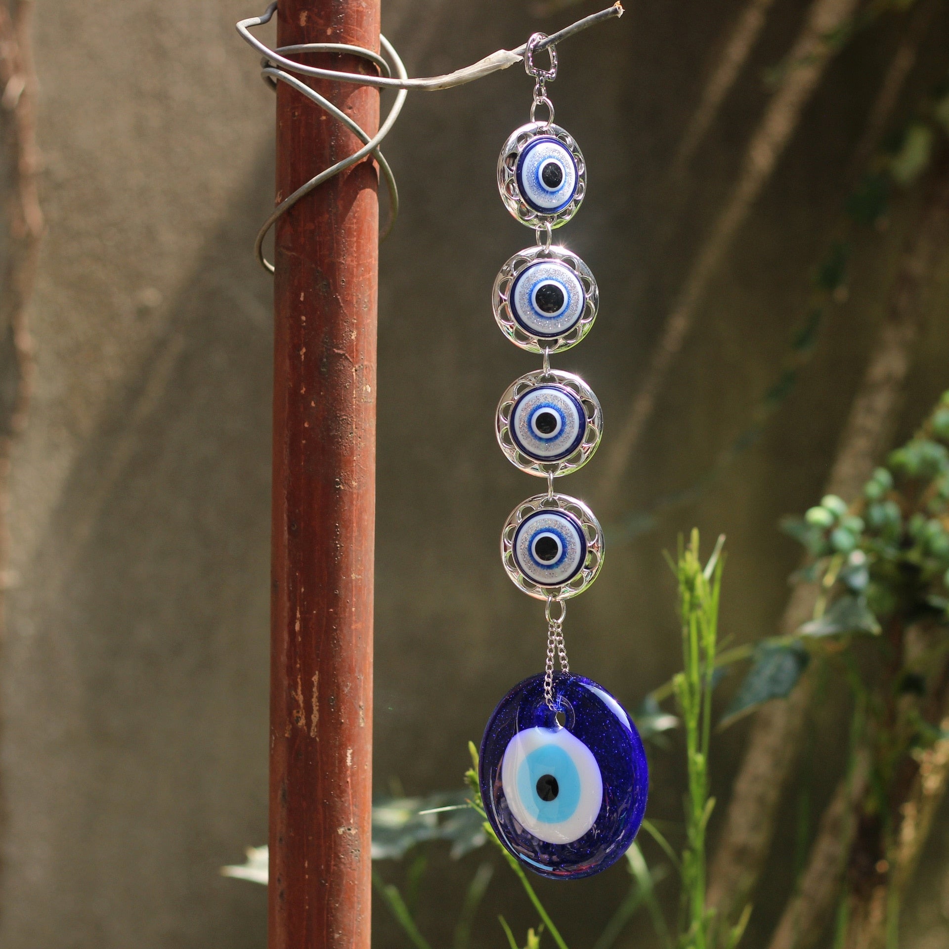 An evil eye hanging is a popular home decor item believed to ward off negative energy and protect against the evil eye. It typically features an eye-shaped charm, often made of glass or metal, which is hung in a prominent location to provide constant protection.